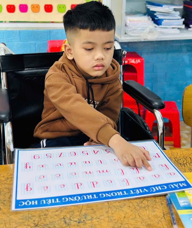 (em Tín đang học bài trên lớp với sự giúp đỡ của thầy cô,bạn bè)