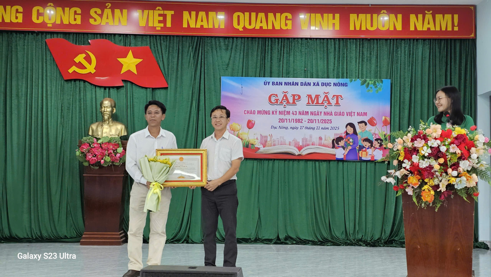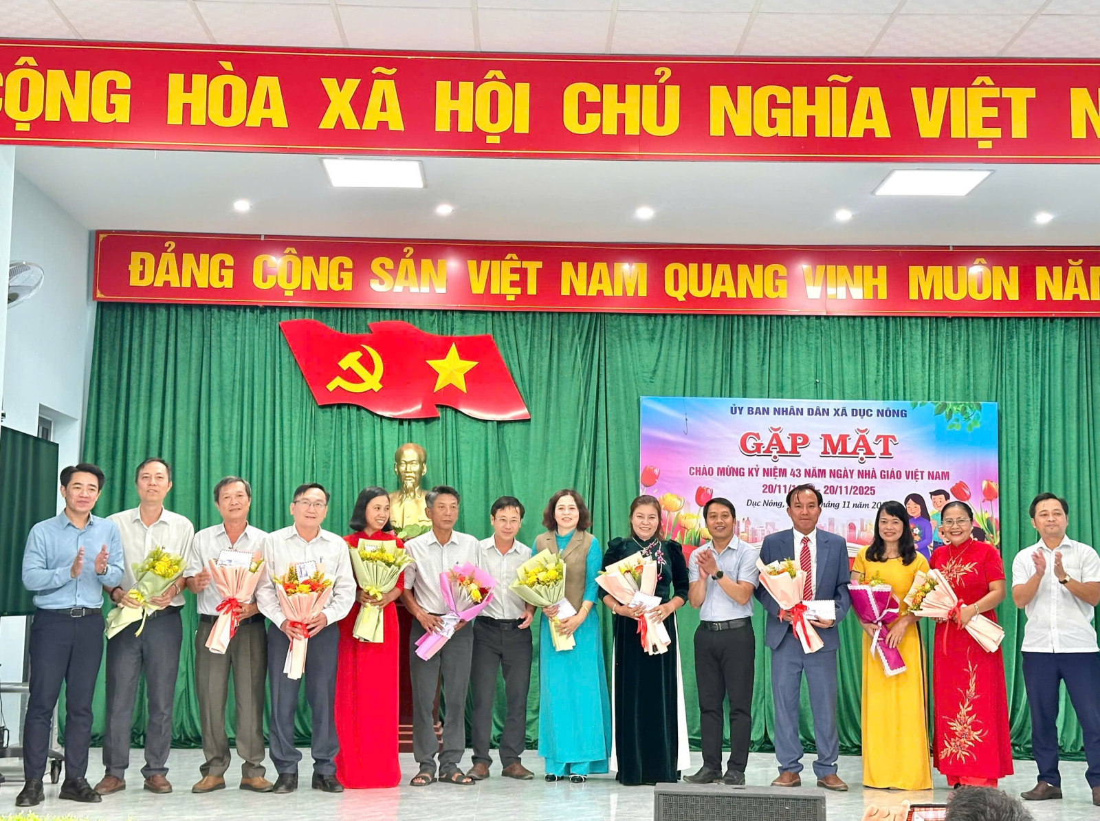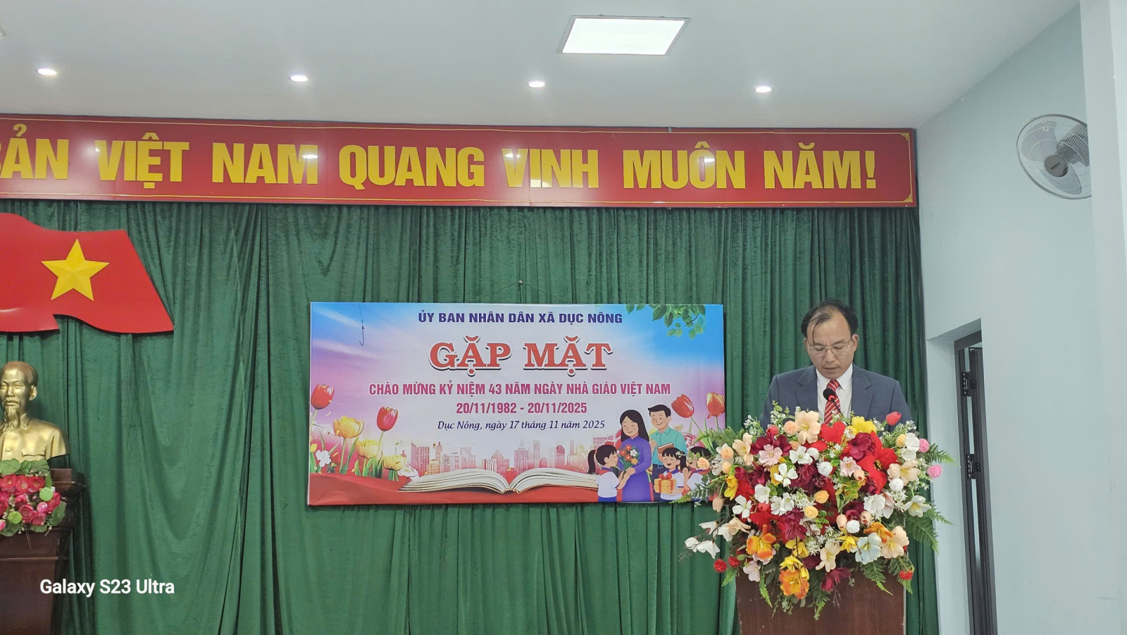 Chiều ngày 17/11/2025, tại Hội trường UBND xã, xã Dục Nông long trọng tổ chức Gặp mặt kỷ niệm 43 năm Ngày Nhà giáo Việt Nam (20/11/1982 – 20/11/2025). Tham dự buổi gặp mặt có các đồng chí lãnh đạo Đảng uỷ, HĐND, UBND xã: Đồng chí A Xây- Bí thư Đảng ủy xã, đồng chí Nguyễn Tiến Huy – Phó Chủ tịch HĐND xã, đồng chí Trần Cao Bảo Việt – Phó Bí thư Đảng ủy, Chủ tịch UBND xã, cùng các đồng chí trong Ban Thường vụ Đảng ủy xã, lãnh đạo các phòng ban chuyên môn, đơn vị trực thuộc UBND xã, cán bộ quản lý, giáo viên cốt cán và giáo viên tiêu biểu của 09 cơ sở giáo dục trên địa bàn xã.